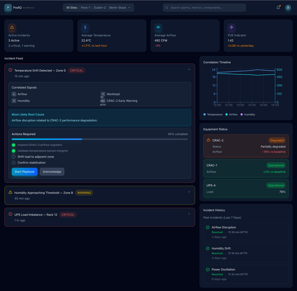 PodIQ interprets alarms, identifies root causes, and guides technicians step-by-step - reducing incidents and improving response time.