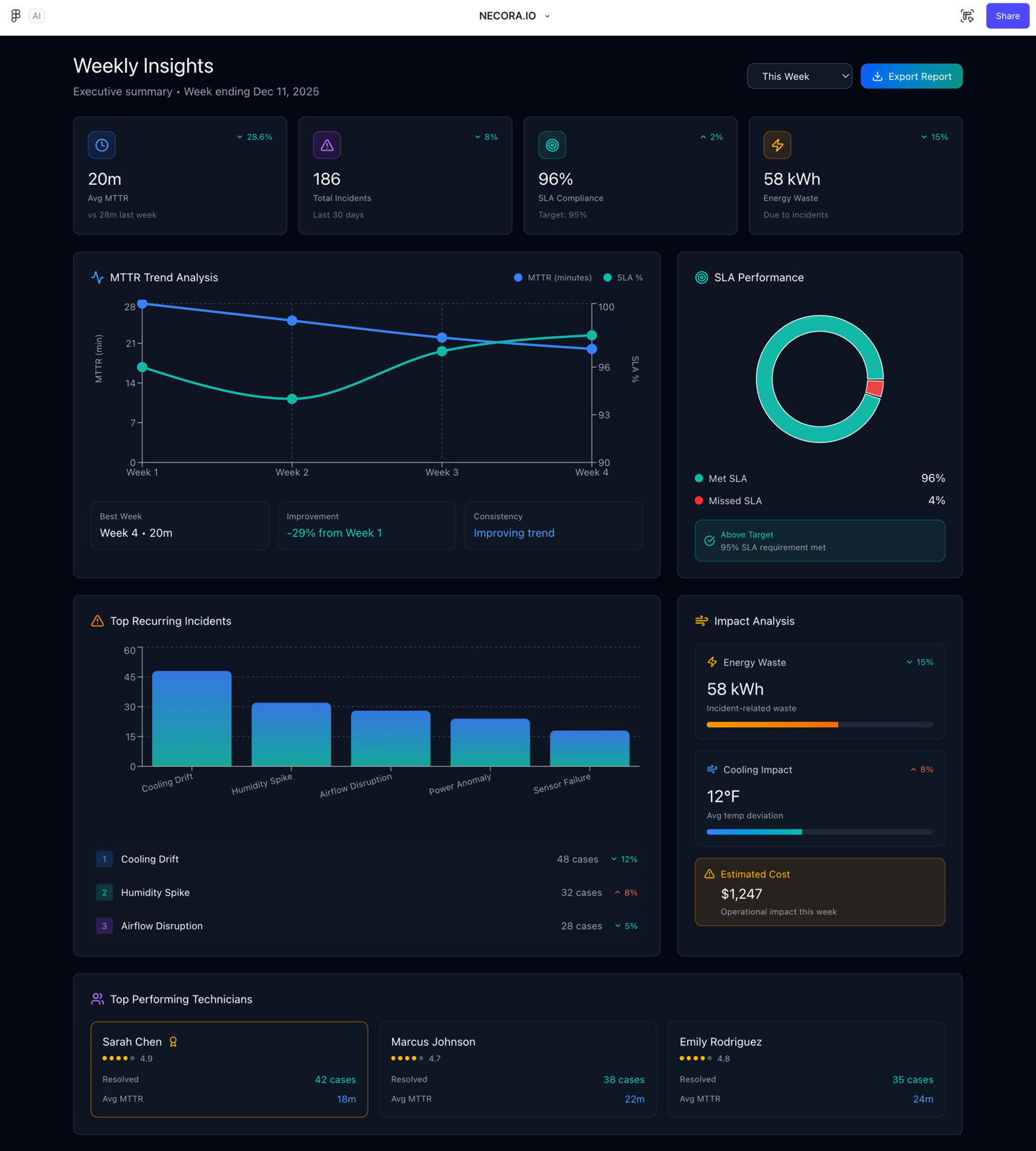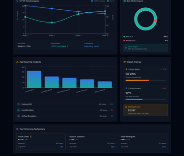 It interprets early signals across your existing DCIM/BMS tools, identifies the most likely root cause, and guides technicians step-by-step through the right action — reducing MTTR and preventing unnecessary escalations.